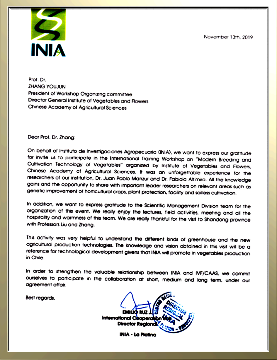 智利農(nóng)科院致中國(guó)農(nóng)科院蔬菜花卉研究所感謝信