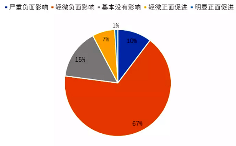 在疫情對所處領(lǐng)域產(chǎn)生的影響上,67%的人選擇輕微負(fù)面作用,15%的人選擇基本沒有影響,10%的人選擇嚴(yán)重負(fù)面影響,7%的人選擇輕微正面作用,僅 1%的人選擇明顯正面作用。