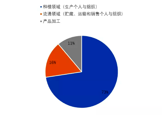 對行業(yè)經(jīng)營主體調(diào)查共收到 135 份問卷,行業(yè)經(jīng)營主體主要包括 生產(chǎn)、儲藏、運(yùn)輸、加工和經(jīng)銷個人與組織,其中種植領(lǐng)域占比 73%, 流通領(lǐng)域占比 16%,產(chǎn)品加工占比 11%。