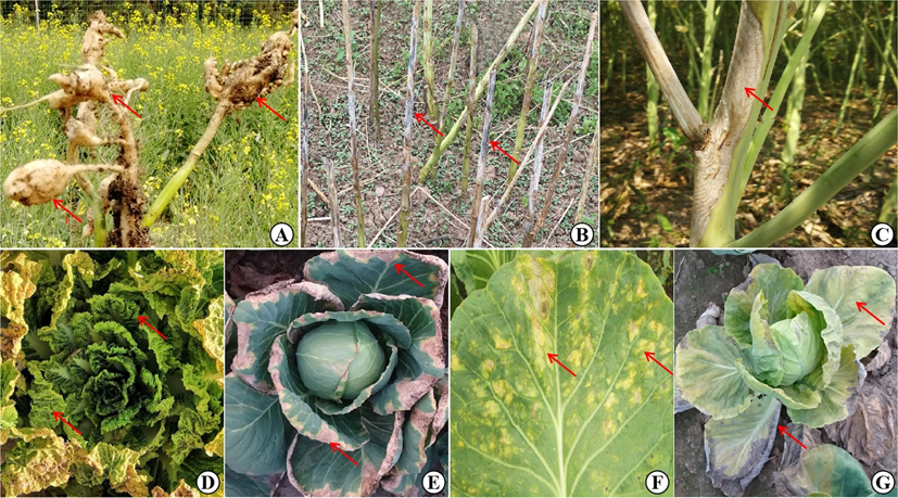蕓薹屬(Brassica)包含許多重要的蔬菜、油料和飼料作物,如白菜、甘藍、油菜、芥菜等。與其它農(nóng)作物一樣,蕓薹屬作物在生產(chǎn)中不斷受到病毒、細菌和真菌等的侵害(圖1),造成了巨大的經(jīng)濟損失。傳統(tǒng)的物理、化學(xué)等防治手段往往操作復(fù)雜、成本高并且容易對環(huán)境造成危害。相比之下,利用作物的自然抗性是最理想的策略。