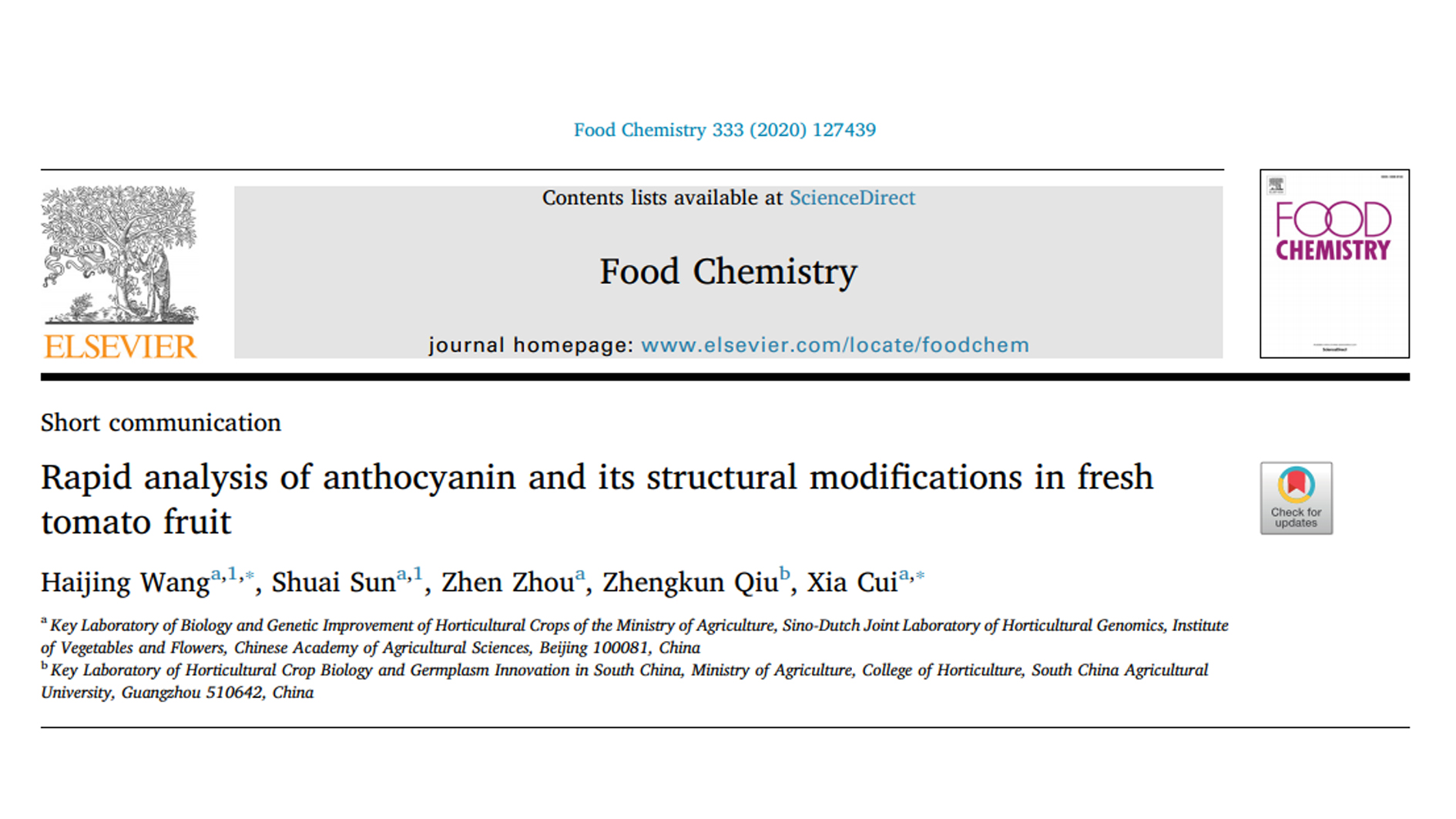 近日,蔬菜花卉研究所崔霞課題組通過(guò)對(duì)紫果番茄中花青素的測(cè)定,解析了番茄果實(shí)中花青素結(jié)構(gòu)及主要修飾類型,并發(fā)現(xiàn)了四種新的花青素成分。相關(guān)研究?jī)?nèi)容“Rapid analysis of anthocyanin and its structural modifications in fresh tomato fruit”于7月4號(hào)在線發(fā)表于Food Chemistry(IF=6.219)上。