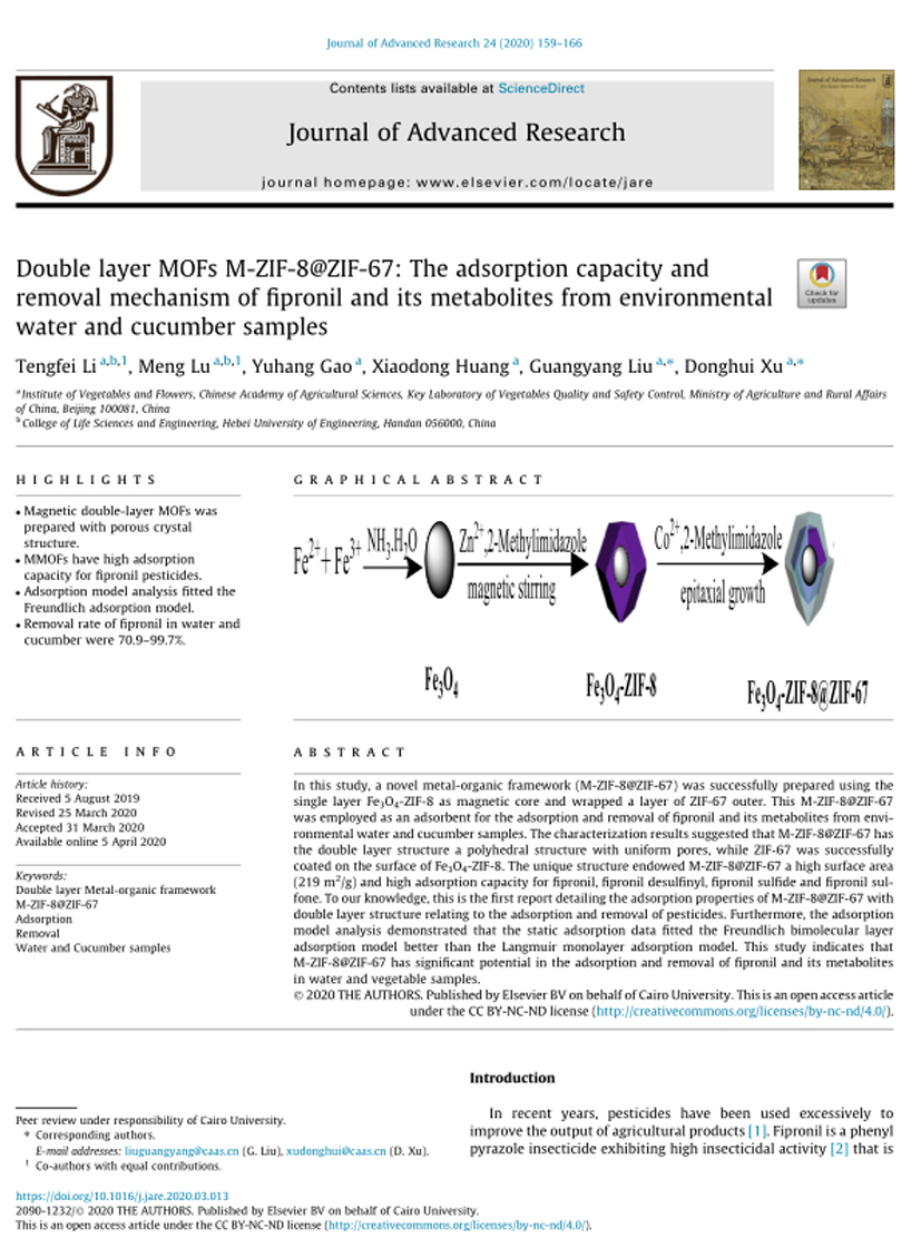 近日,農(nóng)業(yè)農(nóng)村部蔬菜質(zhì)量安全控制重點(diǎn)實(shí)驗(yàn)室在雙層MOFs結(jié)構(gòu)調(diào)控和MOFs型SPE柱研發(fā)方面取得重要進(jìn)展,相關(guān)成果發(fā)表在國(guó)際SCI期刊Journal of Advanced Research(10.1016/j.jare.2020.03.013)上,并成功研制了果蔬農(nóng)藥殘留MOFs型凈化柱產(chǎn)品IVF-MC-1。