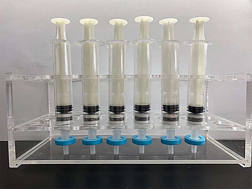 結(jié)合實(shí)驗(yàn)室近四年來(lái)在MOFs/農(nóng)藥互作機(jī)制方面的研究成果和蔬菜質(zhì)檢中心在農(nóng)殘檢測(cè)方面積累的十幾年研究經(jīng)驗(yàn),本實(shí)驗(yàn)室借助MOFs材料的界面超疏水/親水識(shí)別特性,成功研發(fā)了果蔬農(nóng)藥殘留MOFs型凈化柱產(chǎn)品。該前處理柱可特異吸附去除果蔬乙腈提取液中的離子、多糖、色素、蛋白等雜質(zhì),顯著降低基質(zhì)干擾,大幅度縮短前處理時(shí)間、降低實(shí)驗(yàn)成本,有效提高農(nóng)藥殘留前處理方法的回收率、準(zhǔn)確度和重現(xiàn)性。