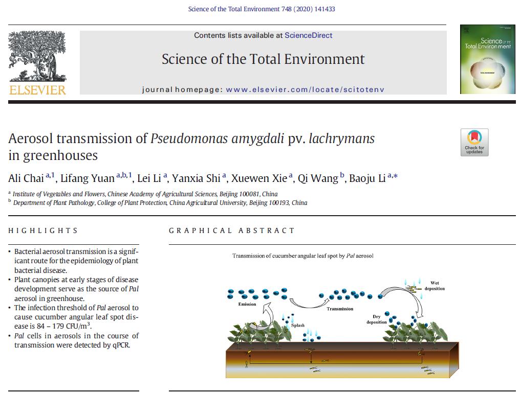 近日,中國農(nóng)業(yè)科學(xué)院蔬菜花卉研究所李寶聚研究員團隊首次發(fā)現(xiàn)氣溶膠是黃瓜細菌性角斑病在設(shè)施環(huán)境的重要傳播途徑,為黃瓜細菌性角斑病的綠色生態(tài)防控提供了新思路。相關(guān)內(nèi)容“Aerosol transmission of Pseudomonas amygdali pv. lachrymans in greenhouses”在線發(fā)表在Science of the Total Environment(1區(qū),IF:6.551)。