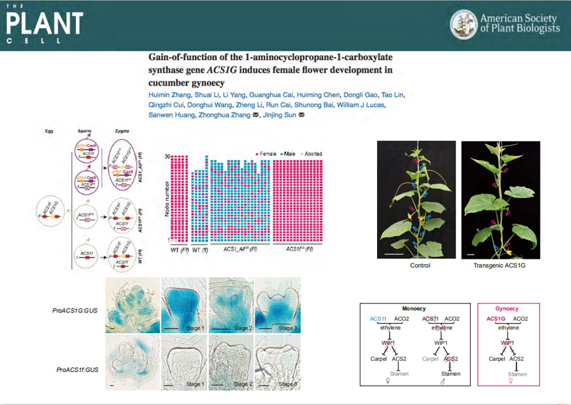 近期,中國農(nóng)業(yè)科學(xué)院蔬菜花卉研究所功能基因課題組首次證實了黃瓜中顯性全雌基因(Female)編碼乙烯合成途徑中的關(guān)鍵酶ACS1G,并深入研究了其作用機制。相關(guān)研究內(nèi)容《Gain-of-function of the 1-aminocyclopropane-1-carboxylate synthase gene ACS1G induces female flower development in cucumber gynoecy》于12月2日在線發(fā)表于《The Plant Cell》上。
