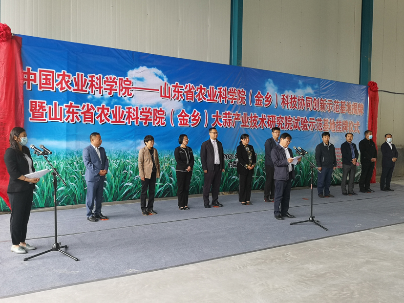 會(huì)上,張圣平副所長(zhǎng)、趙海軍副處長(zhǎng)、崔青副縣長(zhǎng)分別致辭,協(xié)同創(chuàng)新項(xiàng)目子任務(wù)負(fù)責(zé)人王海平研究員介紹了“金鄉(xiāng)大蒜提質(zhì)增效標(biāo)準(zhǔn)化生產(chǎn)技術(shù)研究”任務(wù)情況,莊嚴(yán)處長(zhǎng)作總結(jié)講話,希望項(xiàng)目承擔(dān)和參與單位抓住機(jī)遇,共同協(xié)作,以金鄉(xiāng)大蒜科技創(chuàng)新示范基地創(chuàng)建為契機(jī),為大蒜全產(chǎn)業(yè)鏈的發(fā)展貢獻(xiàn)力量。隨后兩院及金鄉(xiāng)縣政府有關(guān)領(lǐng)導(dǎo)為“中國(guó)農(nóng)業(yè)科學(xué)院-山東省農(nóng)業(yè)科學(xué)院(金鄉(xiāng))科技創(chuàng)新示范基地”揭牌。