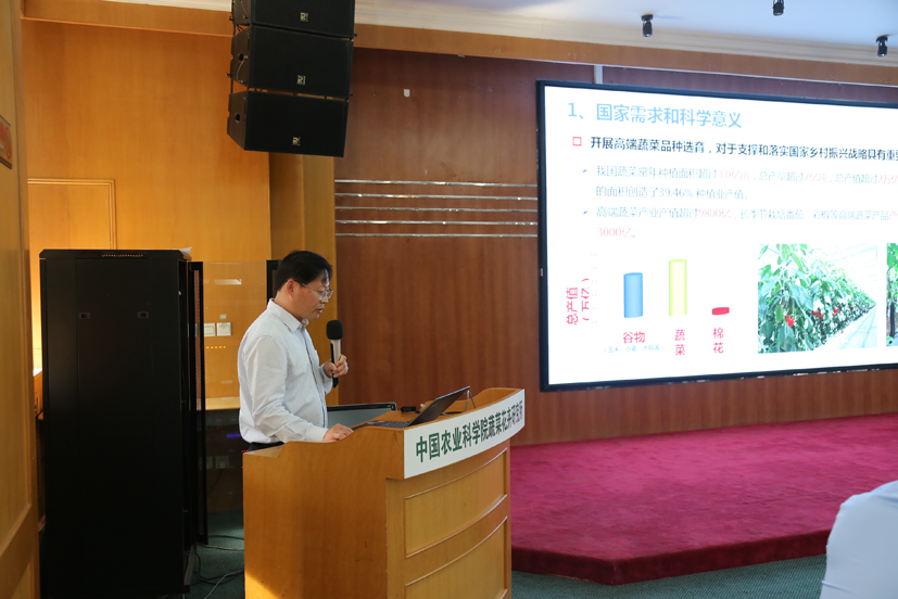 啟動(dòng)會(huì)上,張友軍首先代表任務(wù)牽頭單位對(duì)各位領(lǐng)導(dǎo)和專家的到來表示熱烈歡迎,感謝大家對(duì)蔬菜花卉所的關(guān)心和支持。任務(wù)首席科學(xué)家張圣平研究員圍繞重大任務(wù)“高端蔬菜品種國產(chǎn)化”的立項(xiàng)依據(jù)、研究?jī)?nèi)容與考核目標(biāo)、實(shí)施方案與技術(shù)路線、研究基礎(chǔ)與進(jìn)展、經(jīng)費(fèi)預(yù)算以及下一步工作安排進(jìn)行了具體匯報(bào)。咨詢專家針對(duì)實(shí)施方案、研究?jī)?nèi)容及成果目標(biāo)等提出了指導(dǎo)意見,建議團(tuán)隊(duì)聚焦重要任務(wù),協(xié)同攻關(guān),早日實(shí)現(xiàn)高端蔬菜品種國產(chǎn)化。