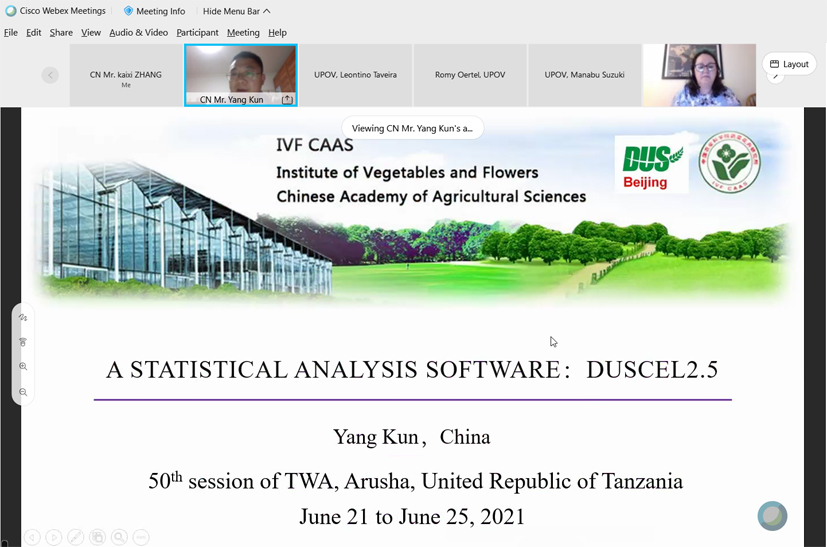 2021年6月21日至25日,國際植物新品種保護聯(lián)盟(UPOV)第50屆農(nóng)作物技術(shù)工作組(TWA)會議在坦桑尼亞聯(lián)合共和國召開。受疫情影響,本屆會議采用視頻方式舉辦。會議由TWA主席Renee Cloutier女士(加拿大)主持,坦桑尼亞農(nóng)業(yè)部植物育種者權(quán)利登記處Twalib Mustafa Njohole先生致歡迎辭,UPOV副秘書長Peter Button先生出席會議并致辭,來自42個國家或組織的100多名代表參加會議并交流。中國派出來自農(nóng)業(yè)農(nóng)村部植物新品種測試中心和10個分中心(站)的27名代表參會,蔬菜花卉所楊坤副研究員全程參加會議。