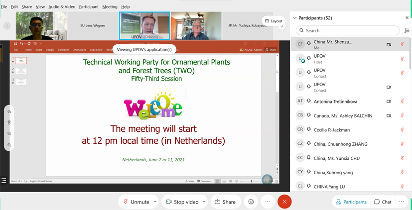 2021年6月7日至11日,國際植物新品種保護(hù)聯(lián)盟(UPOV)第53屆觀賞植物與林木技術(shù)工作組(TWO)會議在荷蘭召開。受疫情影響,本屆會議繼續(xù)采用視頻會議方式召開。會議由TWO主席Ashley Balchin女士(加拿大)主持,承辦國荷蘭農(nóng)業(yè)、自然和食品質(zhì)業(yè)部種子和植物繁殖材料高級政策官員Marien Valstar先生致歡迎辭,荷蘭Naktuinbouw品種測試部門負(fù)責(zé)人Bert Scholte先生致歡迎辭,UPOV副秘書長Peter Button先生出席會議并致辭,來自31個(gè)國家或組織的121名代表參加會議并交流。中國農(nóng)業(yè)農(nóng)村部植物新品種測試中心和8個(gè)測試分中心(測試站)以及國內(nèi)科研院校的共選派22名代表參會,北京分中心付深造博士全程參加會議。