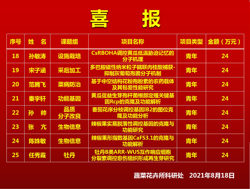 根據(jù)國家自然科學(xué)基金委最新發(fā)布2021年度基金項(xiàng)目評審與資助結(jié)果,中國農(nóng)科院蔬菜花卉研究所2021年度共獲得批準(zhǔn)立項(xiàng)25項(xiàng),其中優(yōu)秀青年科學(xué)基金項(xiàng)目1項(xiàng)(蔬菜蟲害防控團(tuán)隊楊鑫副研究員)、國際合作重點(diǎn)項(xiàng)目1項(xiàng)(蔬菜功能基因組學(xué)團(tuán)隊崔霞研究員)、面上項(xiàng)目13項(xiàng),青年基金項(xiàng)目10項(xiàng),直接經(jīng)費(fèi)總額1446萬元,列居全院第三位,資助率高達(dá)33.3%,列居全院第一位,實(shí)現(xiàn)本所基金資助數(shù)量和資助金額歷史最高,為“十四五”自然基金獲批立項(xiàng)贏得了良好開局。