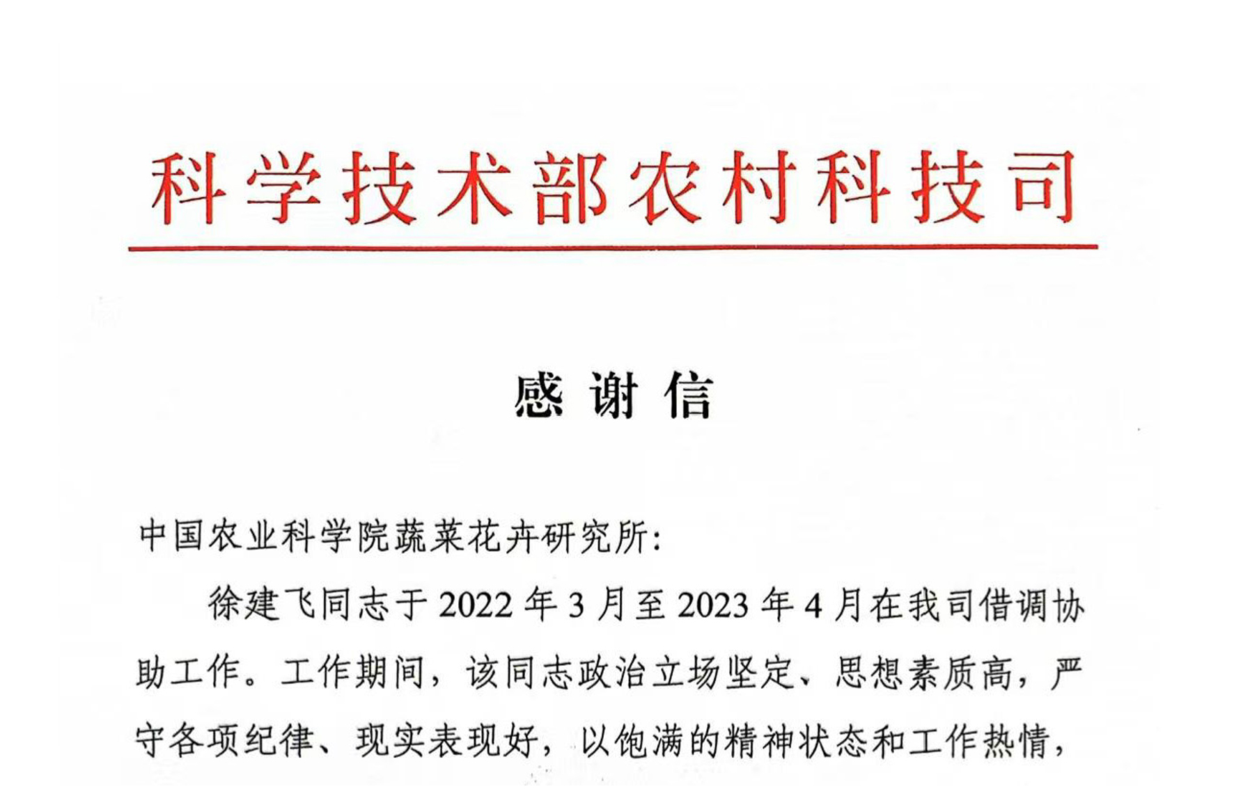 4月28日,科學(xué)技術(shù)部農(nóng)村科技司給我所送來(lái)感謝信,對(duì)馬鈴薯研究室徐建飛同志在農(nóng)村科技司工作期間表現(xiàn)給予高度肯定,同時(shí)對(duì)我所支持農(nóng)村科技司工作表示感謝。