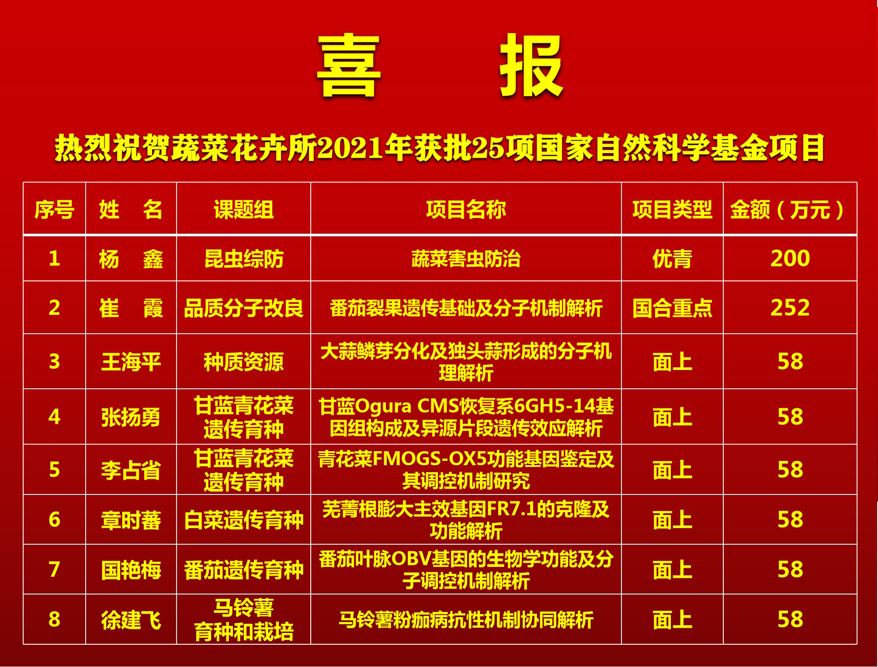 根據(jù)國(guó)家自然科學(xué)基金委最新發(fā)布2021年度基金項(xiàng)目評(píng)審與資助結(jié)果,中國(guó)農(nóng)科院蔬菜花卉研究所2021年度共獲得批準(zhǔn)立項(xiàng)25項(xiàng),其中優(yōu)秀青年科學(xué)基金項(xiàng)目1項(xiàng)(蔬菜蟲害防控團(tuán)隊(duì)楊鑫副研究員)、國(guó)際合作重點(diǎn)項(xiàng)目1項(xiàng)(蔬菜功能基因組學(xué)團(tuán)隊(duì)崔霞研究員)...