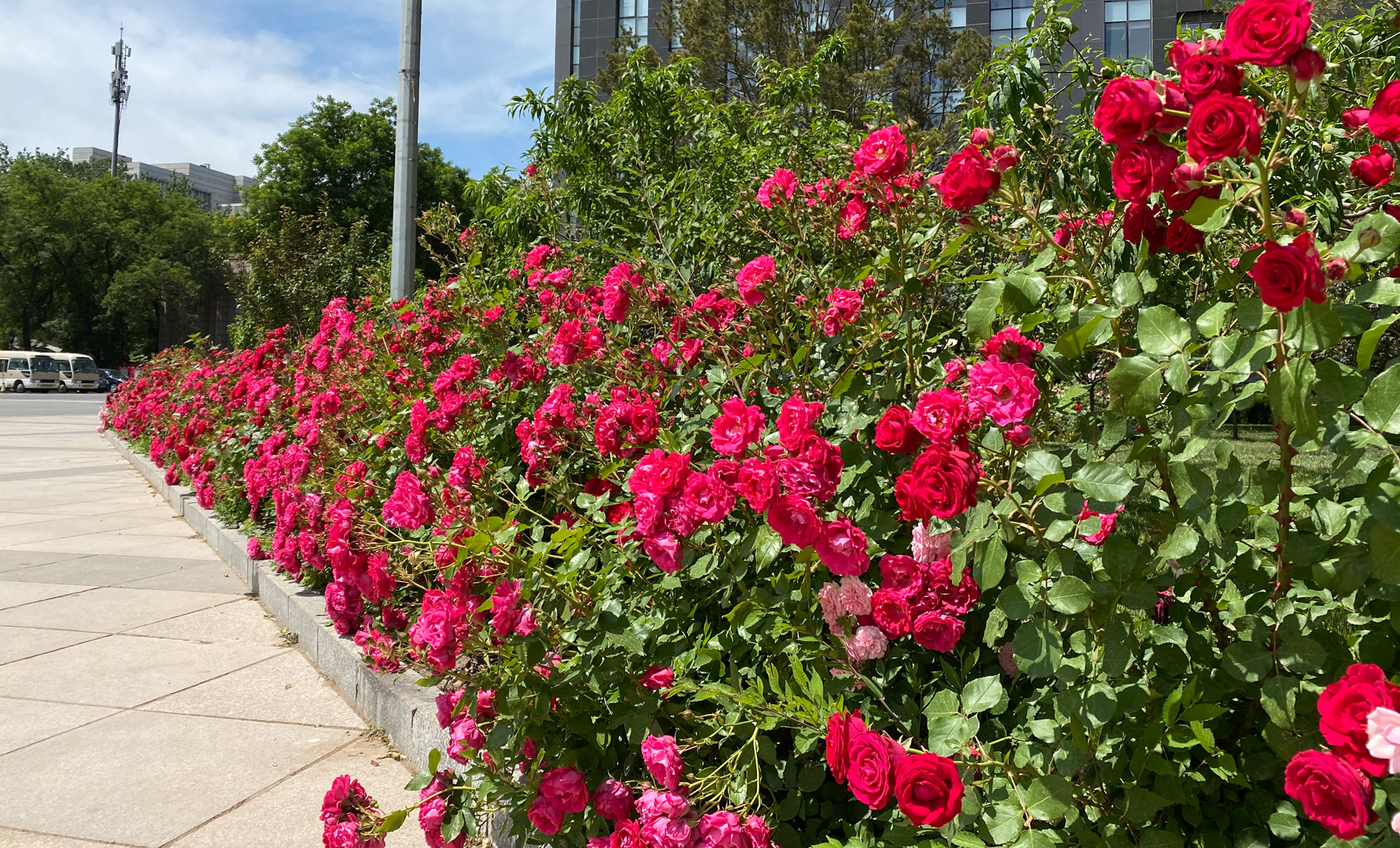 五月,蔬菜花卉研究所自育月季品種‘綠野’、‘紅地毯’、‘粉色回憶’、‘哈雷彗星’、‘鳳凰之光’、‘天香’、‘天山桃園’等競相開放,扮靚了我院中關(guān)村院區(qū)。