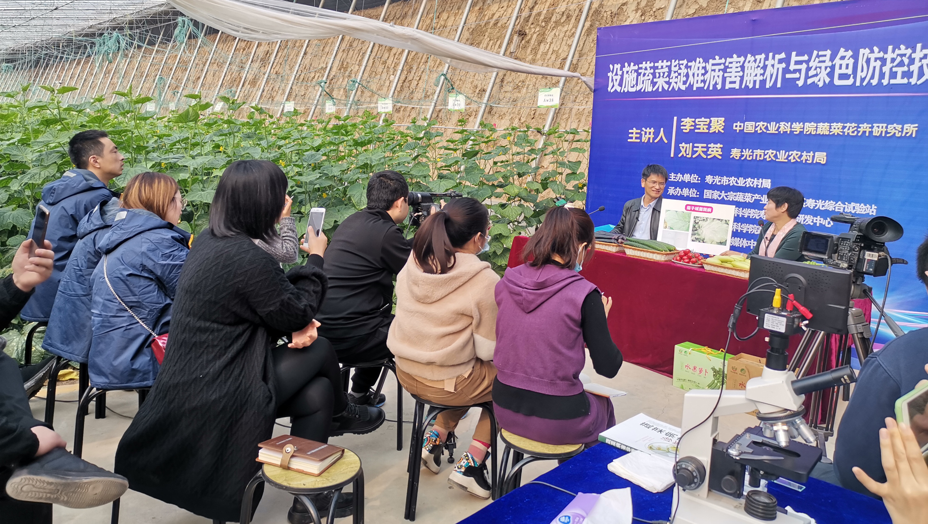 近日,一場主題為“設(shè)施蔬菜疑難病害解析與綠色防控技術(shù)”的直播交流會在洛城街道的一座大棚里拉開了帷幕,蔬菜大棚變身“直播間”,蔬菜花卉所李寶聚研究員與壽光市農(nóng)業(yè)農(nóng)村局劉天英老師現(xiàn)場講技術(shù)。