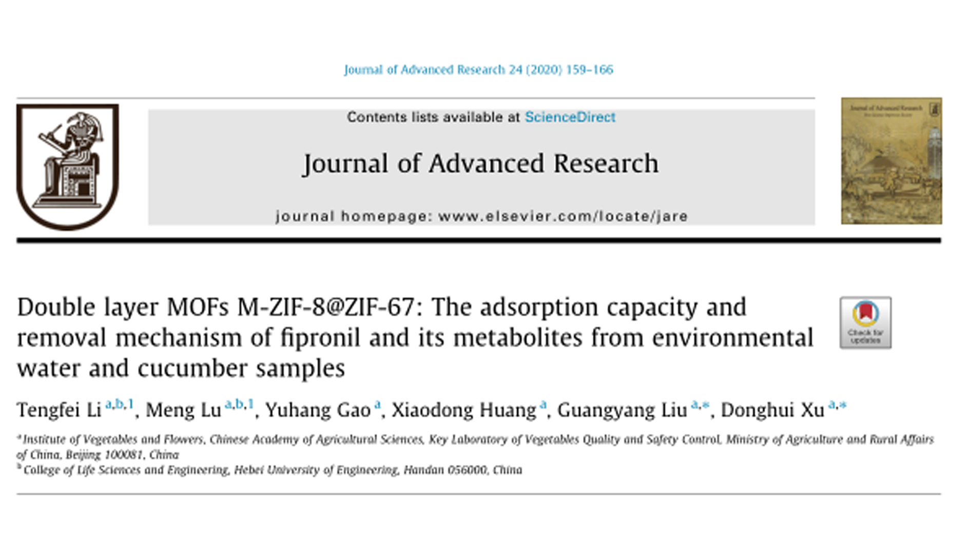 ? ? ? ?近日,農(nóng)業(yè)農(nóng)村部蔬菜質(zhì)量安全控制重點(diǎn)實(shí)驗(yàn)室在雙層MOFs結(jié)構(gòu)調(diào)控和MOFs型SPE柱研發(fā)方面取得重要進(jìn)展,相關(guān)成果發(fā)表在國(guó)際SCI期刊Jou...
