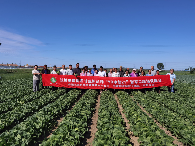為推動科研成果的轉化落地,解決重大流行性病害危害的產業(yè)難題,團隊于7月7日和7月20日先后在甘肅定西和河北張北召開了現(xiàn)場觀摩會,當?shù)赝茝V站、園藝站、農科院的專家及種子經銷商、種植大戶等70多人參與活動。根據(jù)幾個試驗點的綜合結果,YR中甘21田間表現(xiàn)高抗枯萎病(發(fā)病率低于1%)、早熟(熟期約50天)、豐產(單球重0.8-0.9kg),球色亮綠、口感脆甜,價格普遍比國外“硬菜”品種高20-30%,受到大家的一致好評。未來2-3年內,YR中甘21將有望成為高原夏菜甘藍的主栽品種,為菜農增收和鄉(xiāng)村振興做出貢獻。