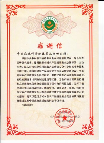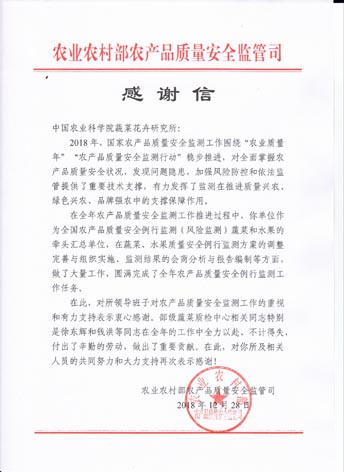 部農產品質量安全監(jiān)管司的感謝信中指出:在2018年全國農產品質量安全監(jiān)測工作中,我所作為種植業(yè)產品例行監(jiān)測的牽頭單位,在監(jiān)測方案的調整完善、組織實施、結果會商及報告編制過程中發(fā)揮了重要作用,圓滿地完成了全年各項工作任務。在推進質量興農、綠色興農、品牌強農進程中提供了強有力的技術支撐。