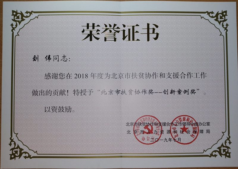 為充分肯定北京市扶貧協(xié)作工作取得的豐碩成果,展現(xiàn)廣大扶貧工作者無私奉獻(xiàn)、頑強(qiáng)拼搏、團(tuán)結(jié)協(xié)作的良好精神風(fēng)貌,進(jìn)一步凝聚合力、激發(fā)動力,北京市扶貧協(xié)作和支援合作工作領(lǐng)導(dǎo)小組辦公室、北京市人力資源和社會保障局決定,對2018年度表現(xiàn)突出的個(gè)人和集體授予“北京市扶貧協(xié)作獎”,其中北京市扶貧協(xié)作獎-創(chuàng)新案例獎20名,中國農(nóng)業(yè)科學(xué)院蔬菜花卉研究所劉偉研究員名列其中。