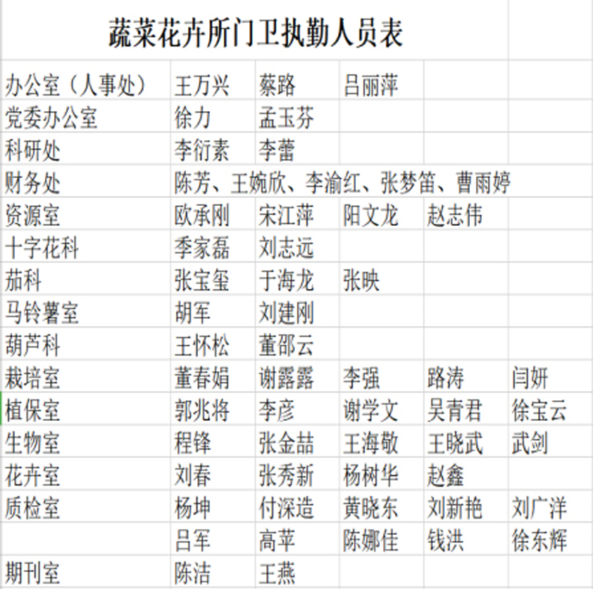 所區(qū)大門是外防輸入、內(nèi)防擴(kuò)散最有效的防線。疫情發(fā)生后,蔬菜花卉所職工積極主動(dòng)報(bào)名所區(qū)志愿工作,經(jīng)綜合協(xié)調(diào),15個(gè)職能處室共計(jì)56人參與所區(qū)大門值守工作,增強(qiáng)值守力量,分擔(dān)后勤一線工作人員壓力,堅(jiān)守筑牢疫情“防火墻”。
