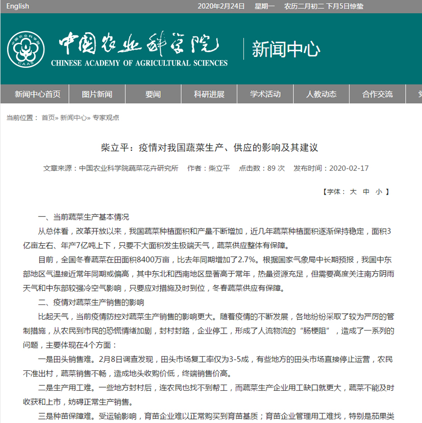 柴立平老師主持的農(nóng)業(yè)農(nóng)村部蔬菜生產(chǎn)信息預(yù)警項(xiàng)目在全國414個(gè)縣布局了1093個(gè)信息采集點(diǎn),此次疫情期間他堅(jiān)守科研一線,為政府決策提供了可靠的數(shù)據(jù)。疫情發(fā)生初期,他未雨綢繆迅速預(yù)判,著手安排調(diào)研調(diào)度疫情對(duì)蔬菜產(chǎn)業(yè)的影響,梳理重要數(shù)據(jù)。隨著防疫形勢(shì)嚴(yán)峻,從大年初一起接到上級(jí)部門的任務(wù)陸續(xù)增多,柴立平老師與項(xiàng)目組成員晝夜突擊工作,從蔬菜生產(chǎn)供應(yīng)角度提交報(bào)告和數(shù)據(jù),確保政府及時(shí)決策。截止目前,先后聯(lián)系各省蔬菜主管部門負(fù)責(zé)人、各省蔬菜協(xié)會(huì)負(fù)責(zé)人、種苗專家和相關(guān)企業(yè)、會(huì)員單位負(fù)責(zé)人等各領(lǐng)域?qū)<?00余人,收集整理材料4萬多字,梳理36張圖表,調(diào)度處理超過6.2萬個(gè)數(shù)據(jù),完成相關(guān)報(bào)告11篇,為蔬菜保供等方面決策提供了依據(jù)。