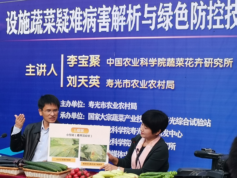 近日,一場主題為“設施蔬菜疑難病害解析與綠色防控技術(shù)”的直播交流會在洛城街道的一座大棚里拉開了帷幕,蔬菜大棚變身“直播間”,蔬菜花卉所李寶聚研究員與壽光市農(nóng)業(yè)農(nóng)村局劉天英老師現(xiàn)場講技術(shù)。