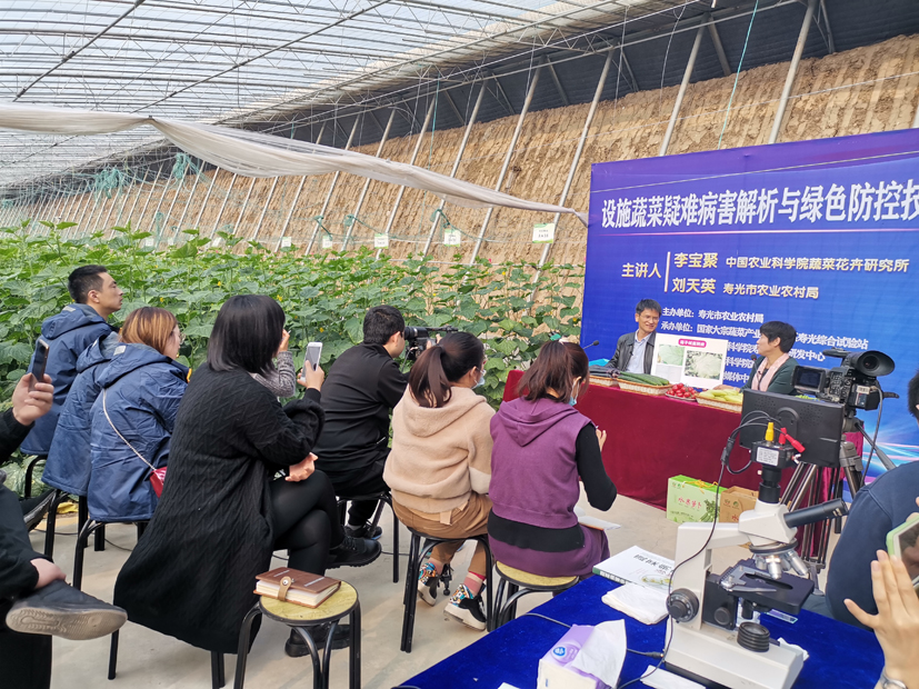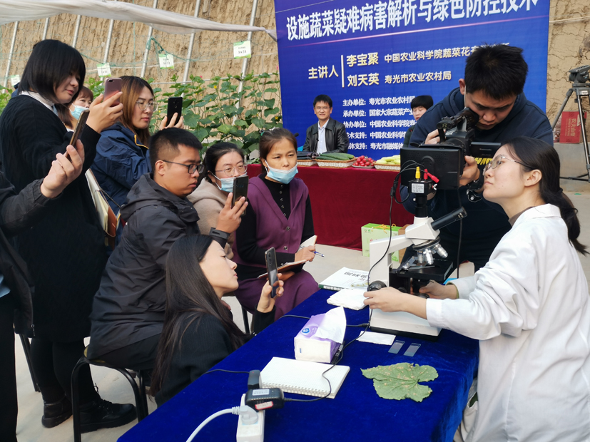 在直播現(xiàn)場,李寶聚老師與劉天英老師一起通過現(xiàn)場技術(shù)講解、典型病害圖板展示、典型病害實物展示、顯微鏡觀察病害致病菌等多種方式與現(xiàn)場以及線上的觀眾朋友們詳細的剖析了多種作物常見病害的病癥、發(fā)病條件及綠色防控技術(shù)。進入冬季后,低溫寡照天氣將逐漸增多,蔬菜生產(chǎn)過程中病害發(fā)生的頻率也越來越高,舉辦這次活動,就是為了將技術(shù)經(jīng)驗及時推廣給更多的菜農(nóng)。